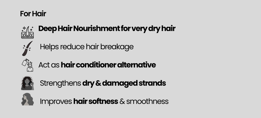 It helps moisturize dry scalp, reduce hair breakage, improve softness, and support healthier-looking hair.