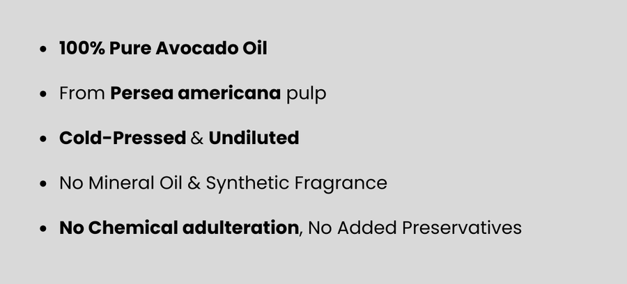 Avocado oil is extracted from the pulp of Persea americana and is traditionally used for deep hair and skin nourishment.