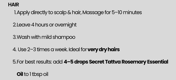 Use 2–3 times per week for hair nourishment. For skin, it can be used daily.
